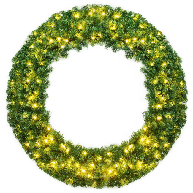 200 warm LED lights bring star-like lighting effects under a dark environment.6 to 18hours timer allows you to preset the lighting time.48 -inches Christmas wreath, 714 branch tips with full shape and lush look.100% new premium PVC new material is non-flammable, non-allergic and odor-free.Shipped with 2-pieces semicircular wreath ring for easy assembly in short timeConvenient storage, lasting durability, for long-term use for yearsSuitable both indoor and outdoor to decorate house beam, window, wall and front doorGenerates a cozy Christmas atmosphere to any place you’d hang it in.