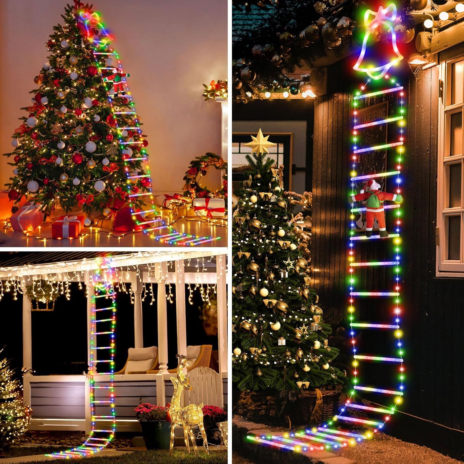 [New Christmas Lights]The latest Christmas lights set with a unique ladder design.Santa Claus stands on the ladder and we can easily hang it on porches, doors, bedrooms, gardens, yards, windows and Christmas trees.Santa Claus climbs up with a gift bag on his back, perfect for indoor and outdoor decoration for Christmas. [Time and memory function]Press the button (timer) on the adapter for 3 seconds, the indicator light turns blue and the timer starts working (6 hours on, 18 hours off).The memory chip saves the last mode you set so you don't have to set it again the next day.Powered by 3 AA batteries (batteries not included), the battery compartment is waterproof for safe outdoor decoration. [8 Lighting Modes]You can simply press the button on the adapter to switch between 8 lighting modes, including 7 flashing modes and 1 steady light mode.LED flashing lights make the whole decoration more innovative and unique.Add more Christmas atmosphere for you. [Removable Santa Claus]The 30cm tall Santa Claus has nylon straps on his hands, which can be easily removable and installed in different places on the ladder to create different visual effects.