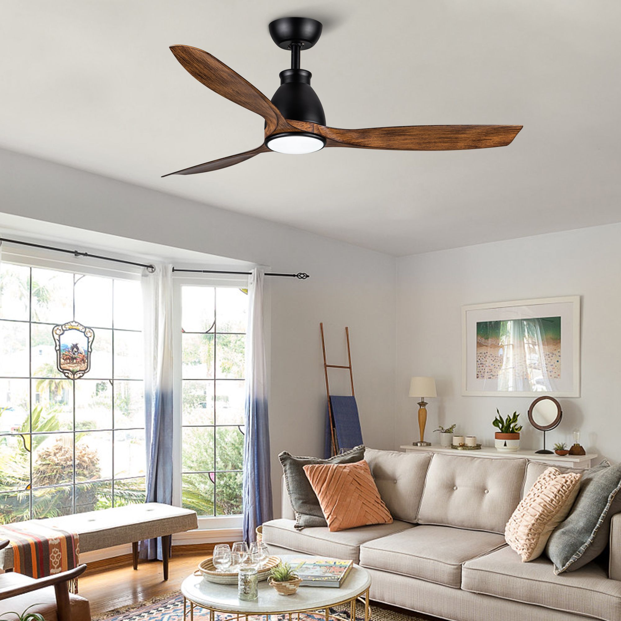 Our 3-blade ceiling fan light provides powerful air circulation and soft lighting. The 3 blades are black walnut-finish. The powerful ceiling fan operates on 6 forward and reverse speeds (easy to adjust with the included handheld remote). Includes a 18-Watt LED light kit that casts light in 3 color temperatures: warm white (3000K), (4500K) and (6000K).