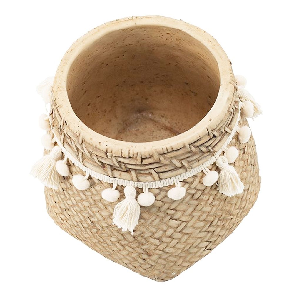 Infuse your floral arrangements with a touch of intrigue by introducing this woven basket planter to your space. The warm, cream color of the tassels offset the natural brown hue of the cement, providing an eye-catching contrast that is sure to capture the attention of your guests. Measuring a compact 6.5D x 6H, this piece will comfortably hold your favorite small plants.