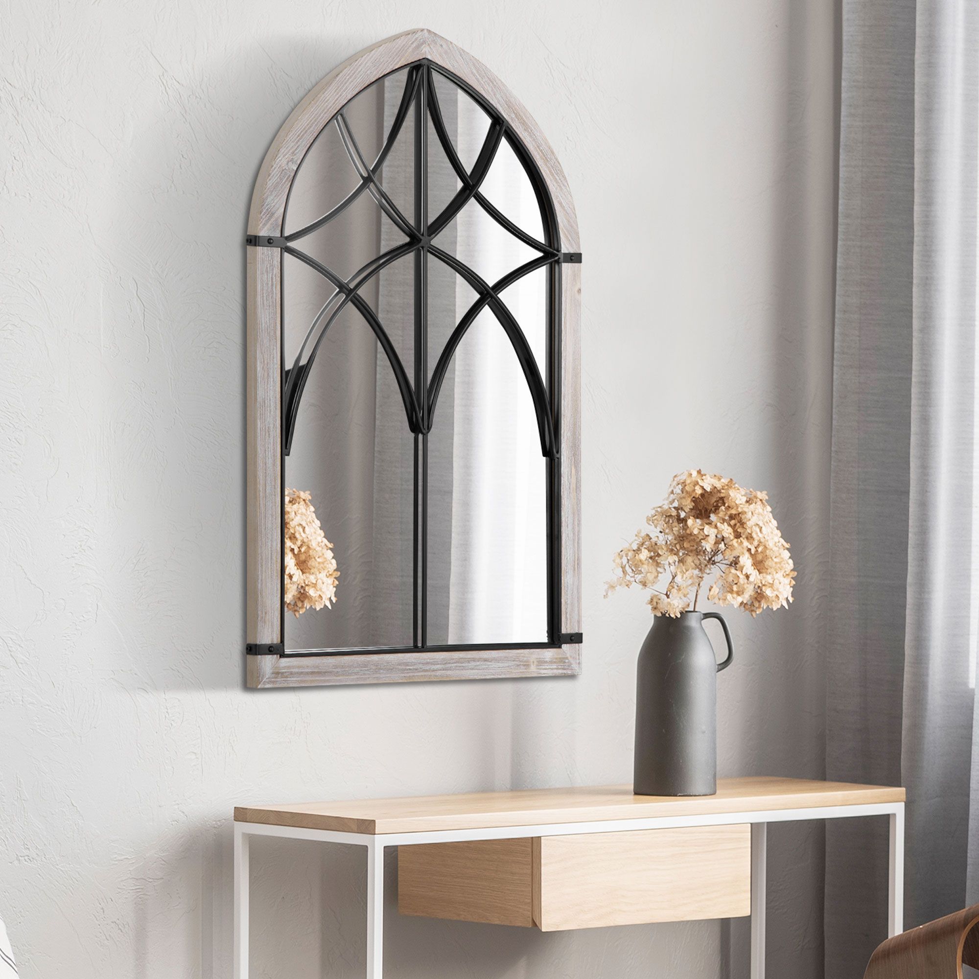 1.- Beautiful Décor Piece: With an arched trellis windowpane frame, and a distressed natural wood finish, this arched mirror decorates your wall while making your home brighter and more spacious by reflecting the light.