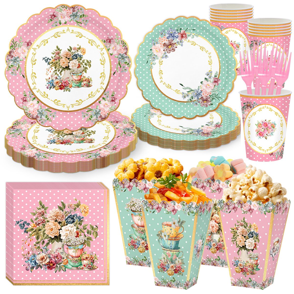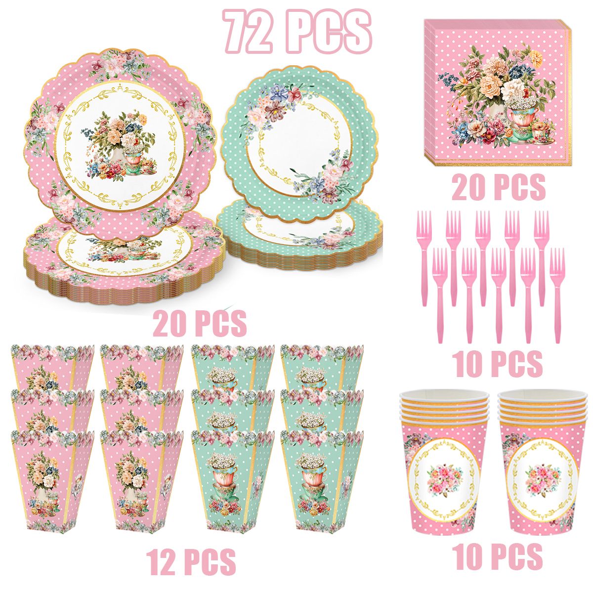 72 Pcs Tea Party Supplies Floral Party Dinnerware Serves 10 Disposable Tableware Supplies 10 Paper Tea Cups 20 Saucers Plates 20 Napkins and 12 Popcor
