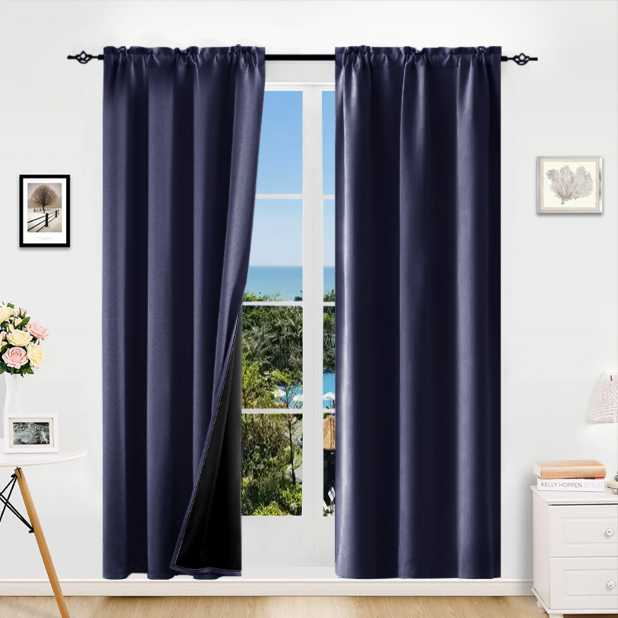 ndoor blackout curtains are made of polyester fiber, which can block 95% of sunlight and ultraviolet rays. Thermal backed liner can bring blackout effect that the ordinary curtain can not be compared to. The darker the color of the fabric, the more light it can block. Our curtain panels used in the living room can not only isolate the heat in summer and the cold in winter, but also reduce external noise, thereby saving energy costs.